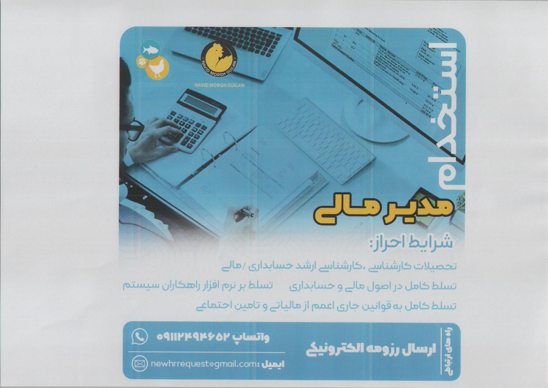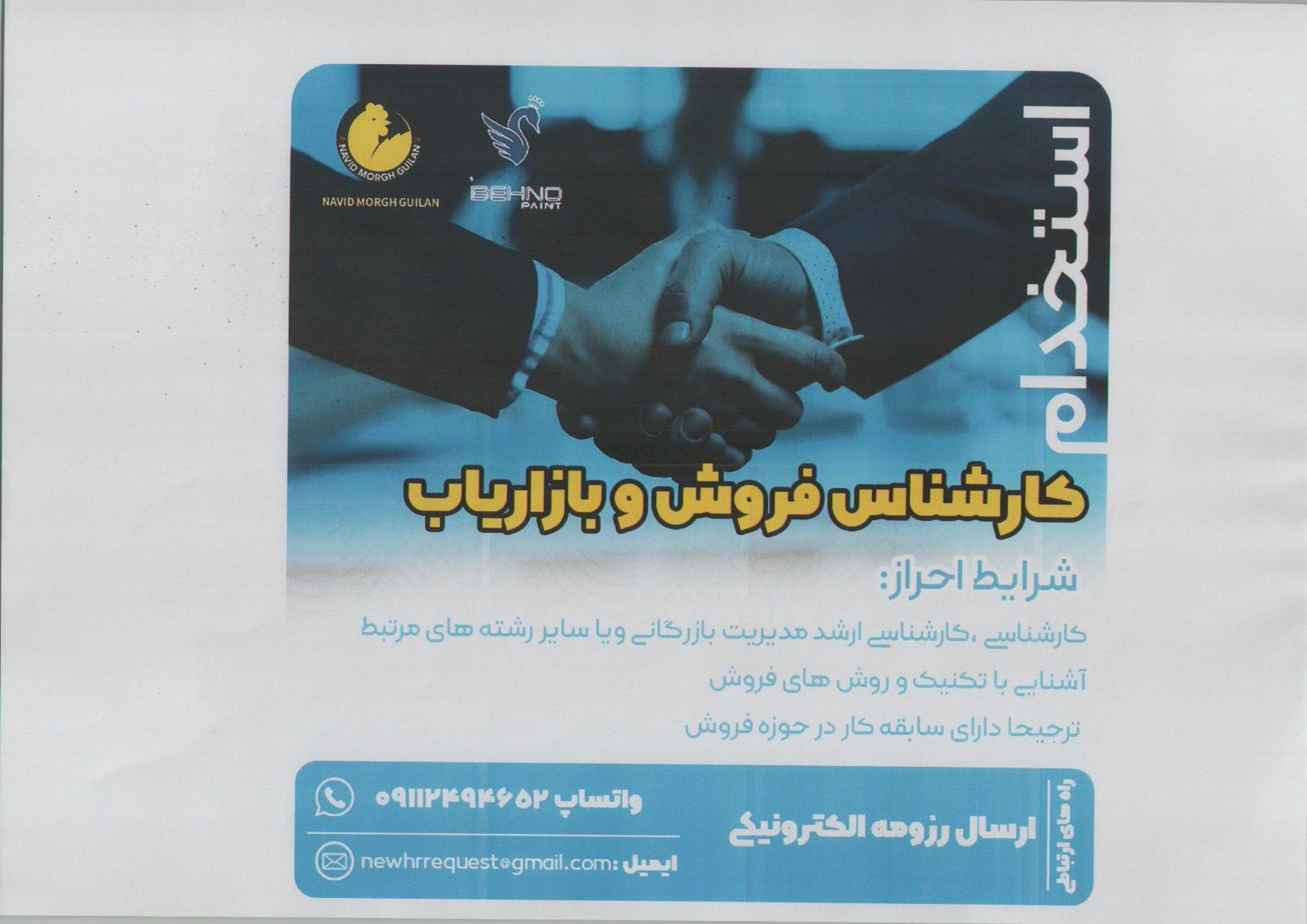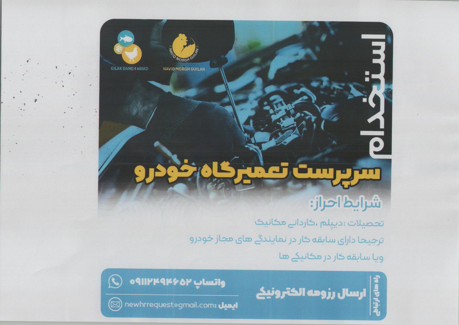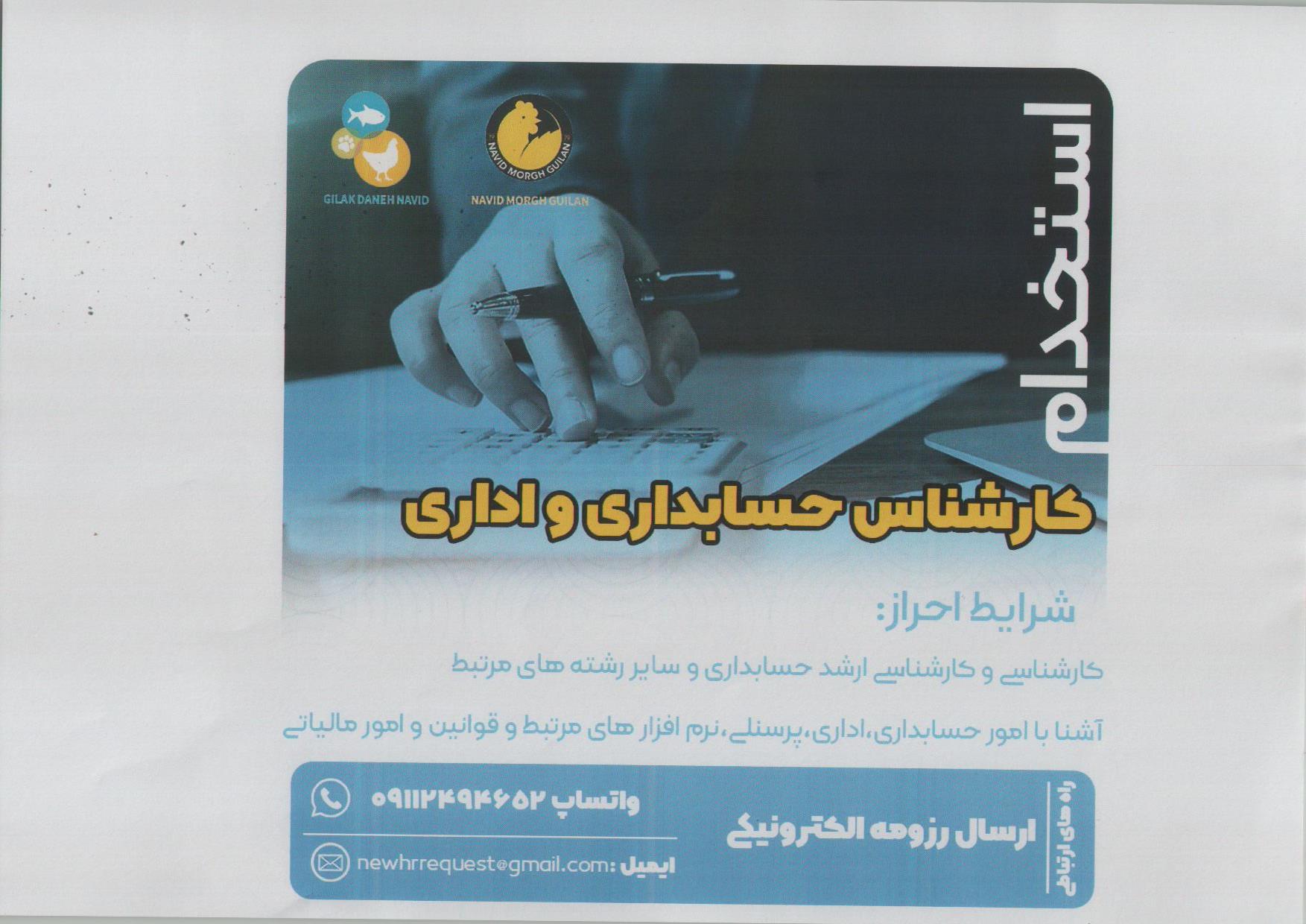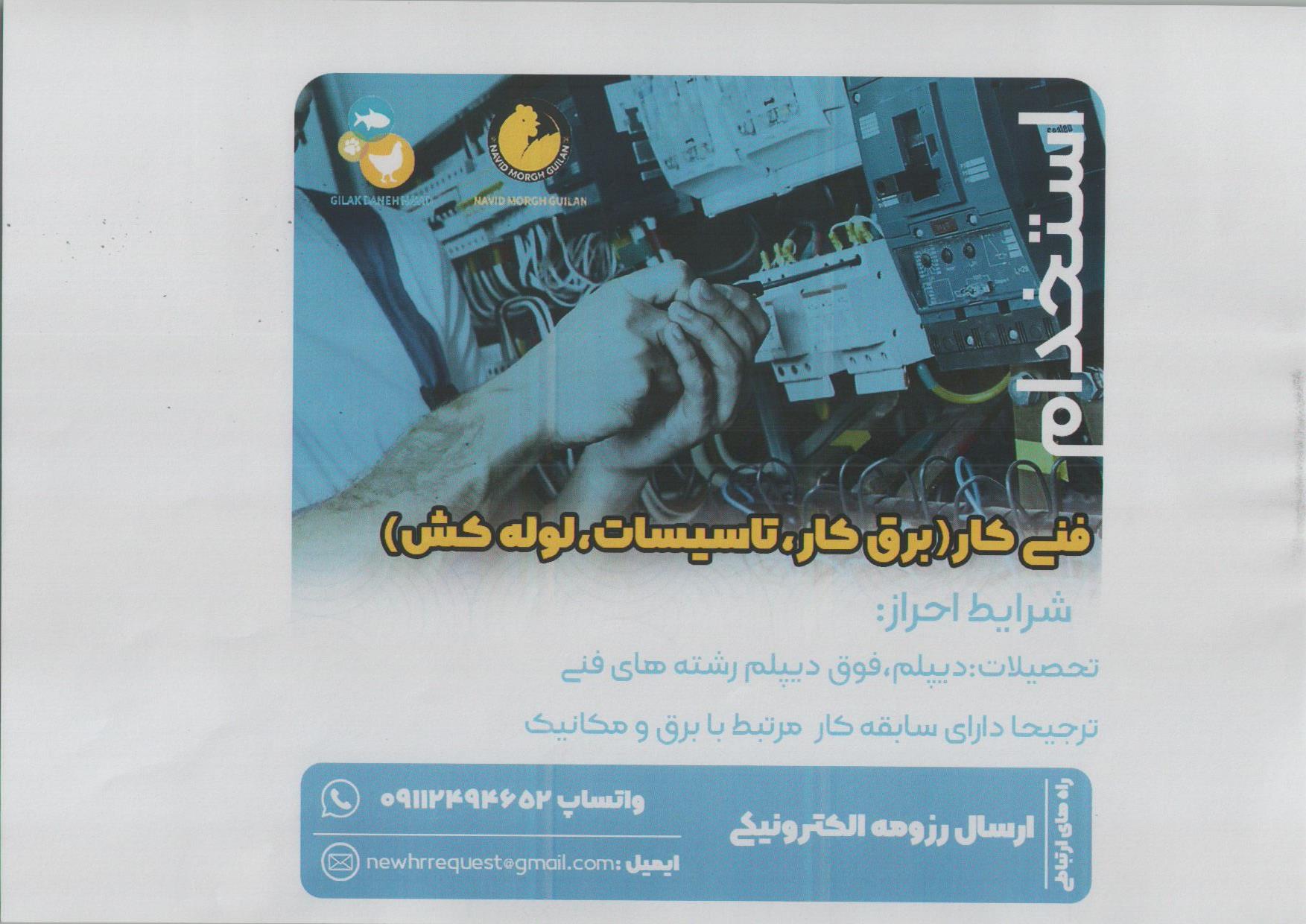 شرکت زنجیره نوید مرغ گیلان در نظر دارد جهت تکمیل کادر پرسنلی خود در بخش مهندسی مکانیک ،حسابداری ، مدیریت بازرگانی و علوم دامی تعدادی نیروی مستعد جذب نماید. علاقه مندان میتوانند از طریق شماره و آدرس ایمیل ذکر شده مدارک خود را ارسال نمایند. شایان ذکر است افراد پس از مصاحبه ،کسب امتیاز لازم و گذراندن دوره آموزشی در این مجموعه مشغول بکار خواهند شد.